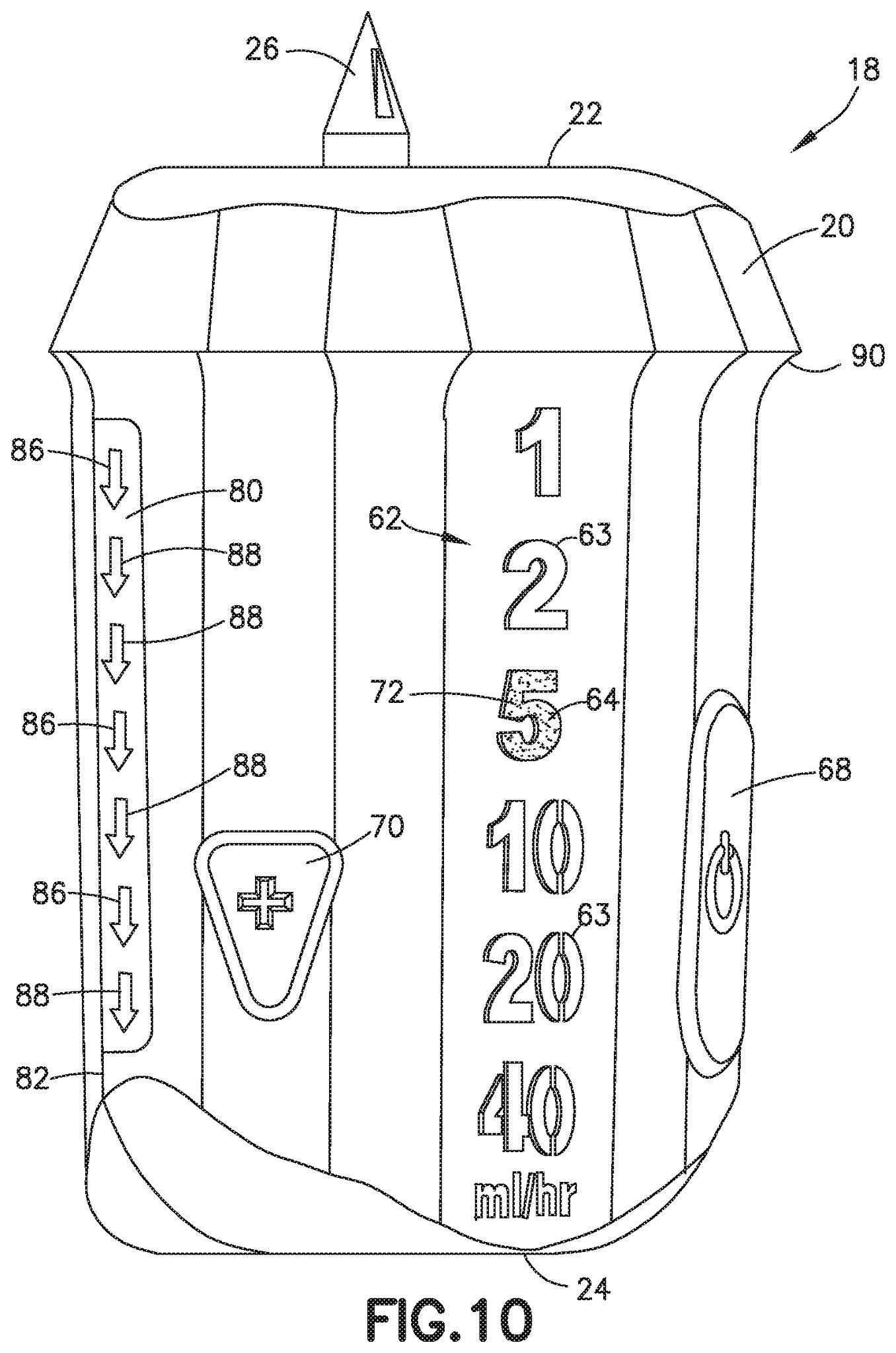 During infusion, additional light features are present on both sides of the pump which indicate flow by providing a scrolling light downward to signify the direction of flow. In this function, the light would be greatly diffused to avoid disturbing the patient or others nearby. These side lights also provide a separate function by flashing bright red light when the pump is pausing infusion due to a system alarm, such as pump occlusion.